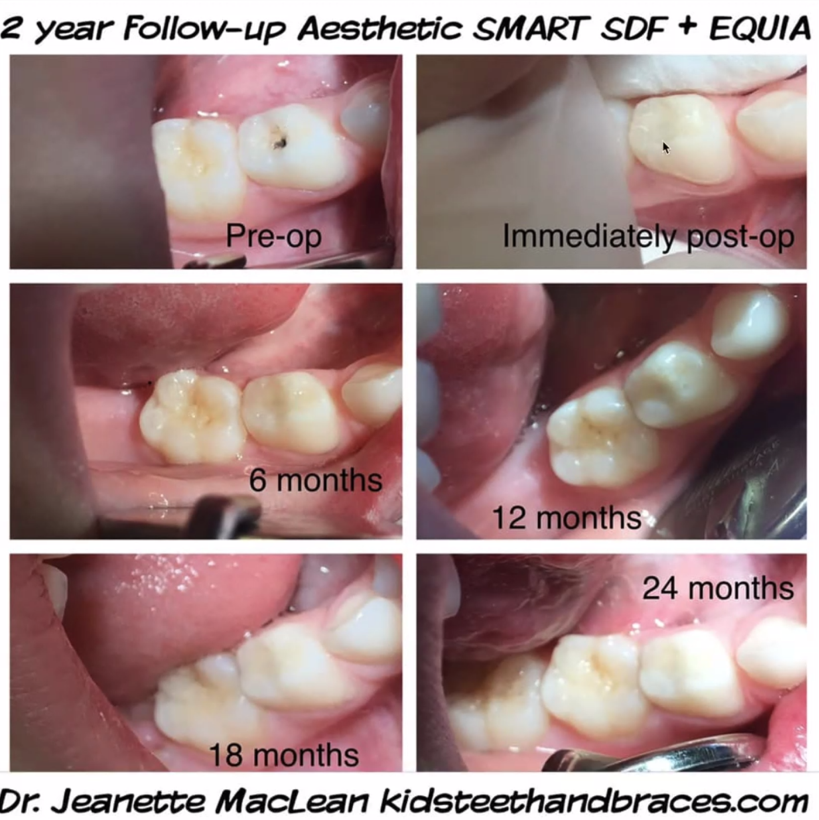 One important thing to know is that SDF permanently stains the area of decay where it is placed. This color change shows that the cavity has been treated.